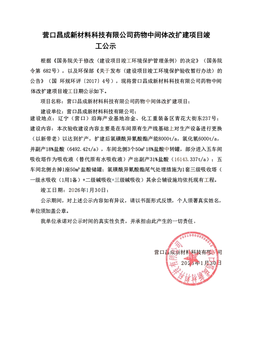 營口昌成新材料科技有限公司藥物中間體改擴建項目竣工公示